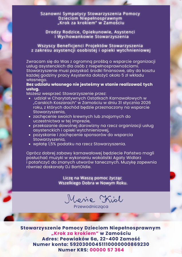 aktualności, Czwartek, 8 stycznia 2026Szanowni Sympatycy Stowarzyszenia Pomocy Dzieciom Niepełnosprawnym „Krok za krokiem” w Zamościu