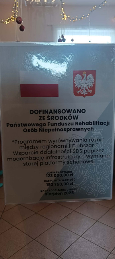 aktualności, Poniedziałek, 12 stycznia 2026Stowarzyszenie Pomocy Dzieciom Niepełnosprawnym "Krok za krokiem" w Zamościu informuje o zrealizowanym zadaniu pn. "Wsparcie działalności Środowiskowego Domu Samopomocy poprzez modernizację infrastruktury i wymianę starej platformy schodowej" dofinansowane z Państwowego Funduszu Rehabilitacji Osób Niepełnosprawnych w ramach "Programu wyrównywania różnic między regionami III" w obszarze F przekazanych przez Powiat Zamojski.
